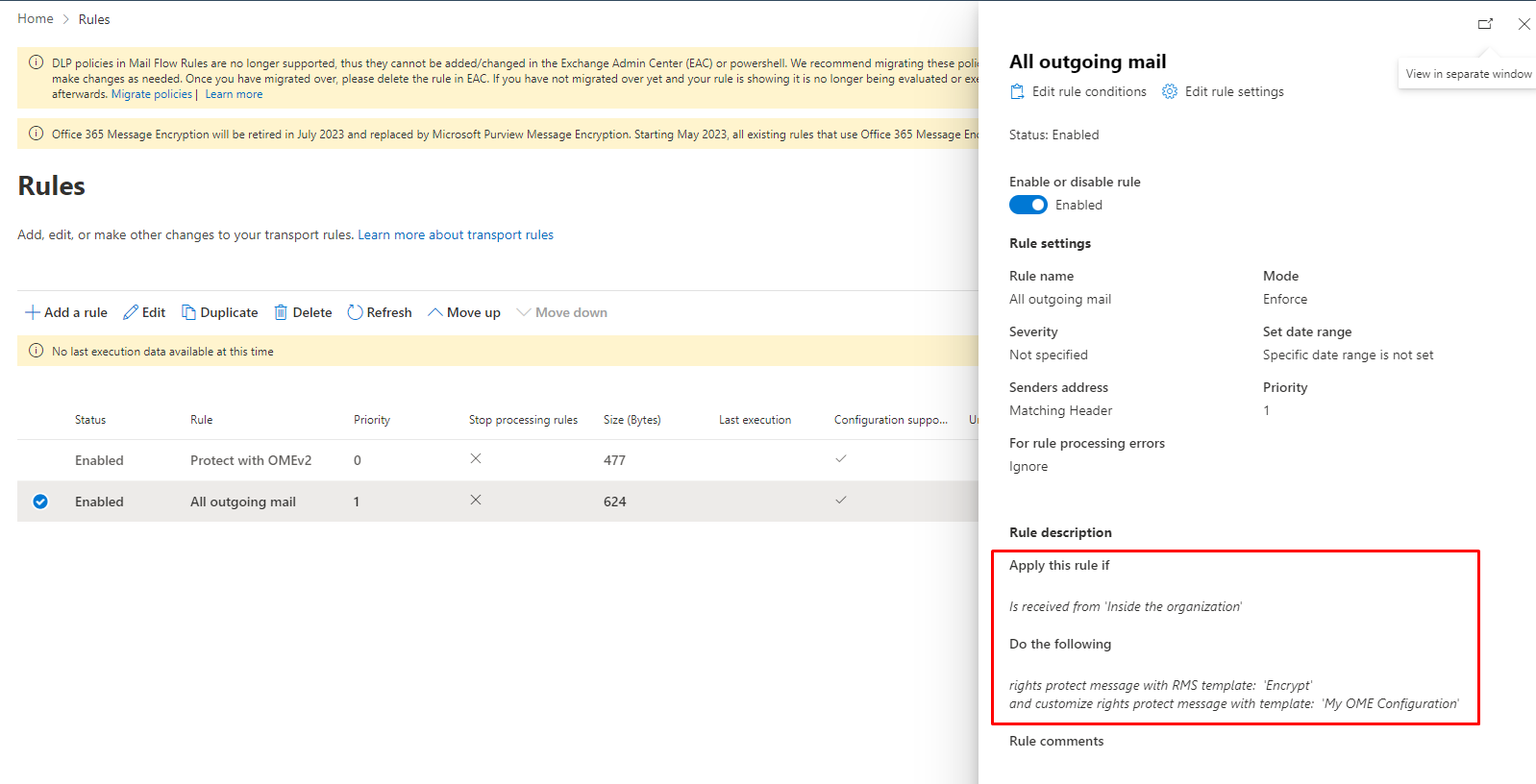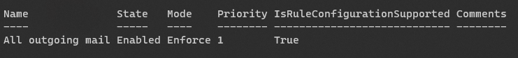 New-TransportRule -Name "All outgoing mail" ` -FromScope "InOrganization" ` -ApplyRightsProtectionTemplate "Encrypt" ` -ApplyRightsProtectionCustomizationTemplate "My OME Configuration"