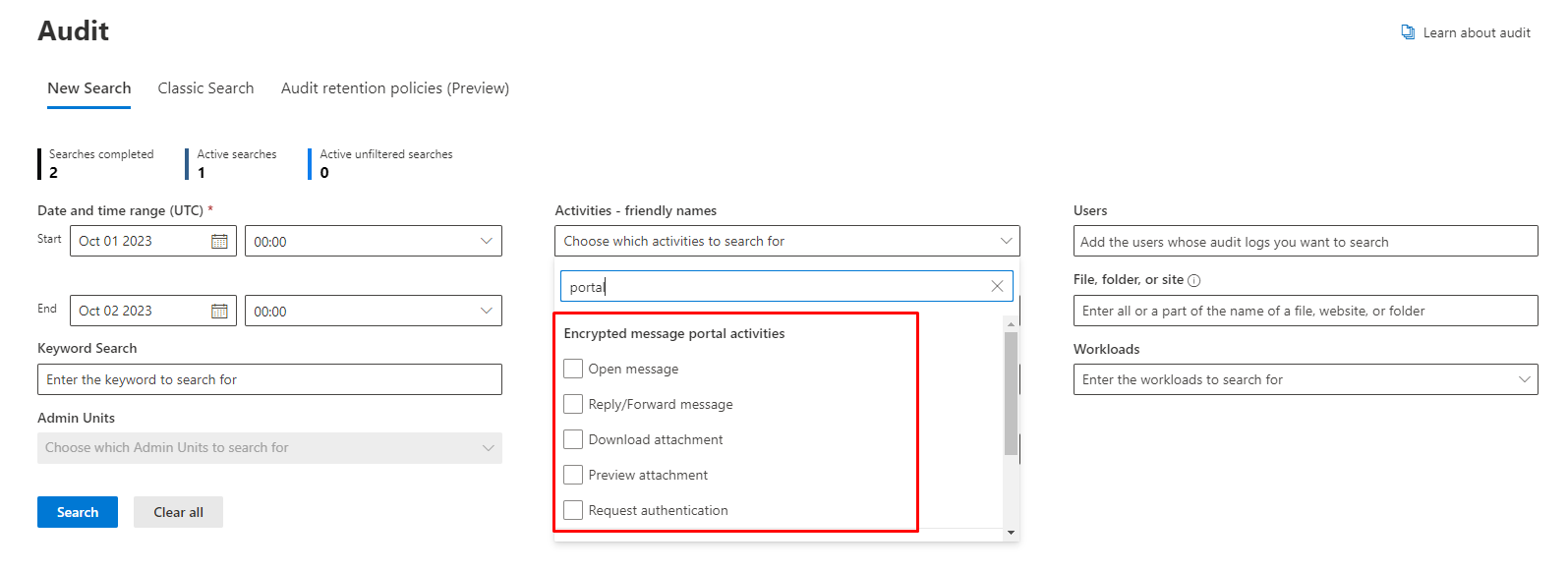 | Encrypted Message Portal Activity Log | Monitor external activities in the encrypted message portal with Microsoft Purview Advanced Message Encryption. |