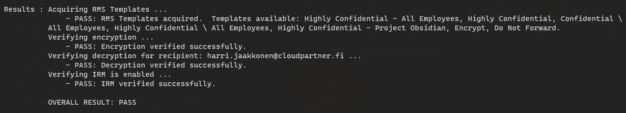 Import-Module ExchangeOnlineManagement Connect-ExchangeOnline -UserPrincipalName <YourOwnSpecialUPN> Test-IRMConfiguration -Sender <email address> -Recipient <email address>