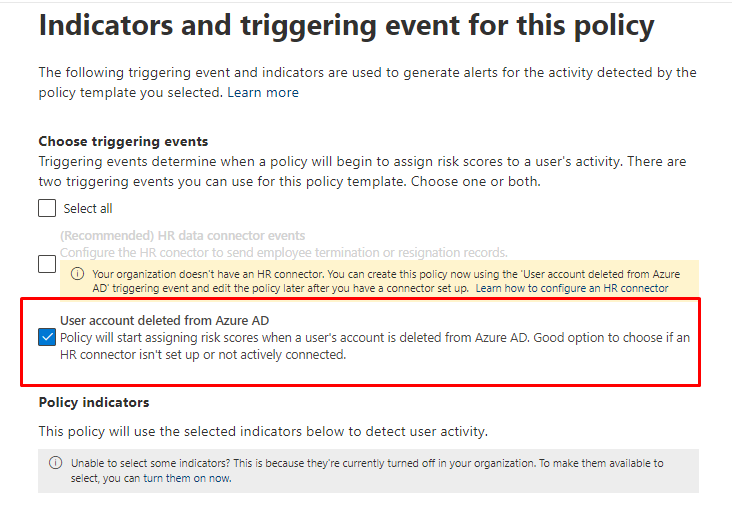 And then to choose a HR connector (if created) and a trigger for Azure AD user account deletion.