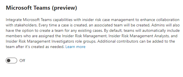 After Microsoft Teams is enabled for insider risk management, a dedicated Microsoft Teams team is created every time an alert is confirmed and a case is created. By default, the team automatically includes all members of the Insider Risk Management, Insider Risk Management Analysts, and Insider Risk Management Investigators role groups (up to 100 initial users). Additional organization contributors may be added to the team after it is created and as appropriate. For existing cases created before enabling Microsoft Teams, analysts and investigators can choose to create a new Microsoft Teams team when working in a case if needed. Once you resolve the associated case in insider risk management, the team is automatically archived (moved to hidden and read-only).