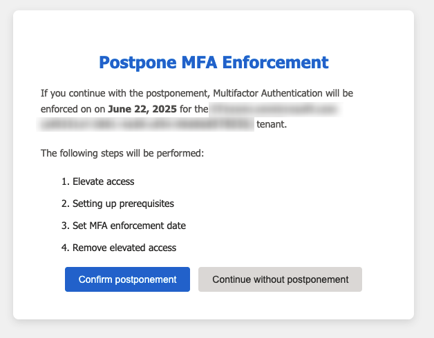 The second screen offers a Postpone MFA Enforcement option, allowing tenant administrators to delay enforcement until a specified date (e.g., June 22, 2025). Choosing this requires elevated access and involves setting up enforcement prerequisites, after which MFA will be automatically required at the postponed date.