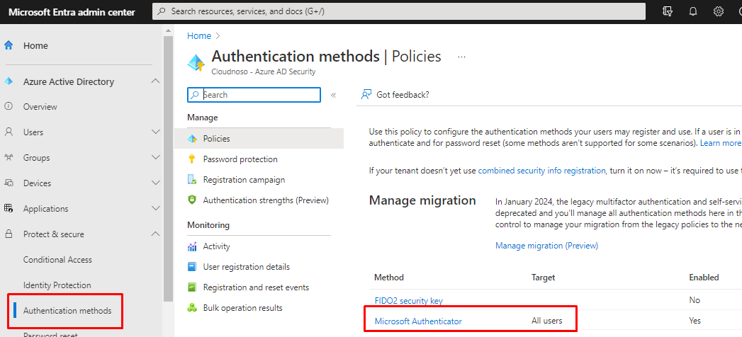 Open authentication methods from https://entra.microsoft.com/#view/Microsoft_AAD_IAM/AuthenticationMethodsMenuBlade/~/AdminAuthMethods