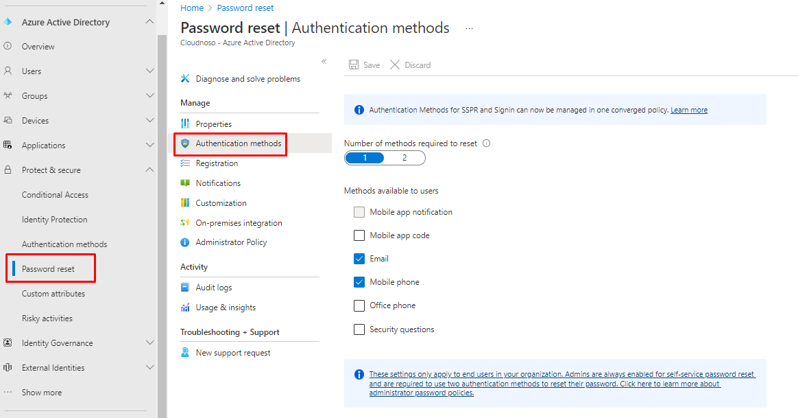 The legacy rules for self-service password reset and multifactor authentication will be phased out in January 2024, and you'll control all authentication methods here in the authentication methods policy.
