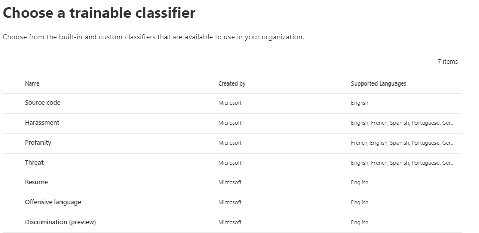 Microsoft defined a set of classifiers, basically classifier are what ever info you want to find from the files, it could be (like in MS classifiers) Offensive language or threats. Classifiers support multiple languages so they can be used also in global organizations.