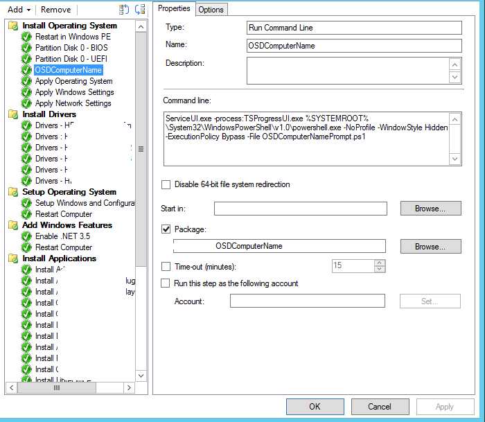 The command itself is: ServiceUI.exe -process:TSProgressUI.exe %SYSTEMROOT% \System32\WindowsPowerShell\v1.0\powershell.exe -NoProfile -WindowStyle Hidden -ExecutionPolicy Bypass -File OSDComputerNamePrompt.ps1During installation, the Computername prompt will look like this:
