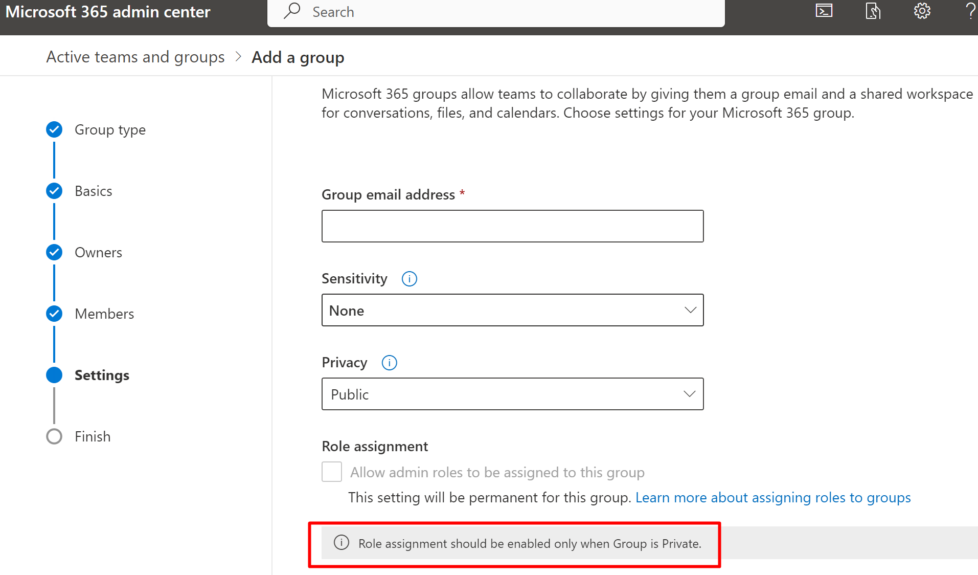 And inside Microsoft 365 admin center it will look like this. You just have to make the group Private instead of Public.