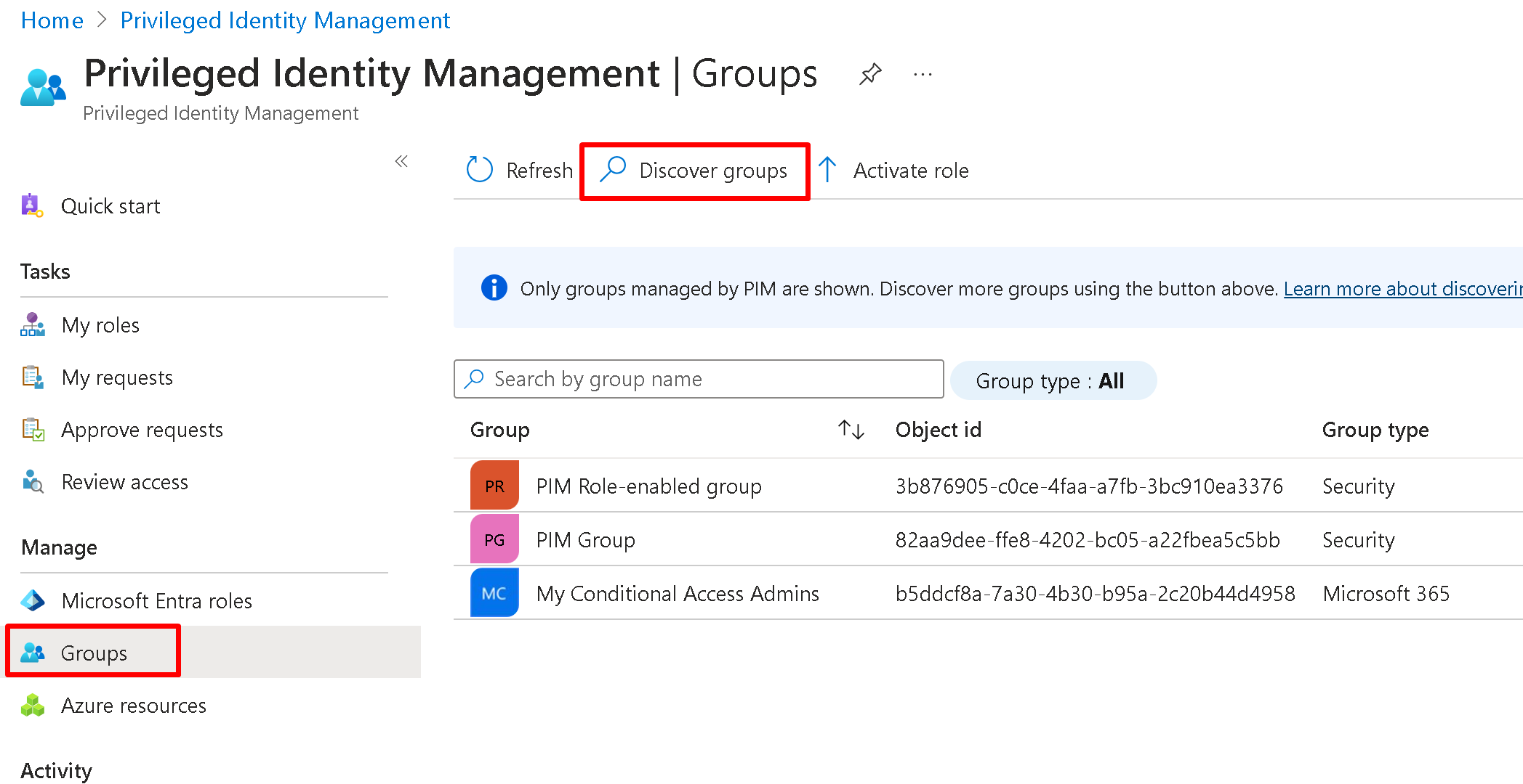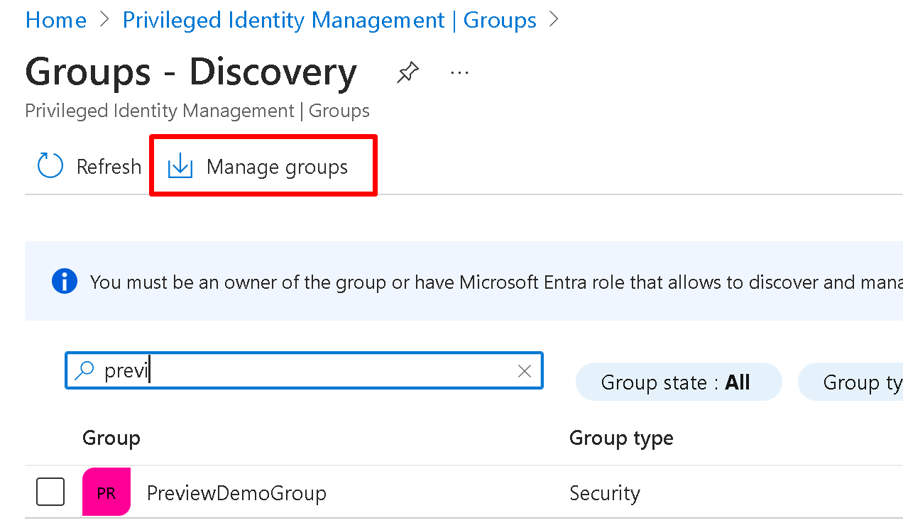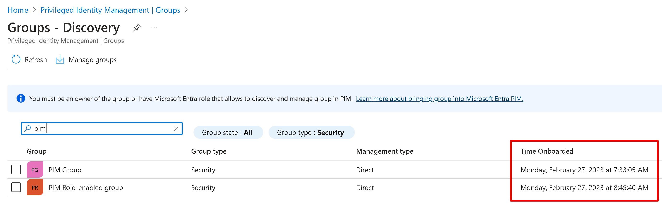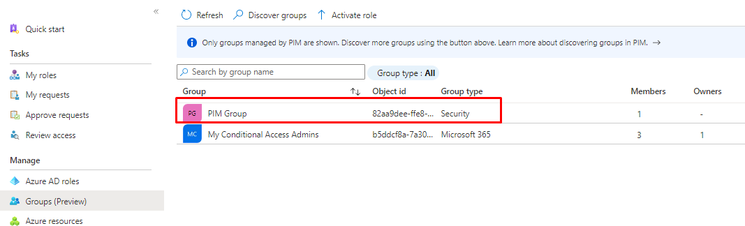 Once done, you will see it under Groups inside PIM. A group cannot be removed from management after it has been put under it. The removal of PIM settings by another resource administrator is therefore prevented.