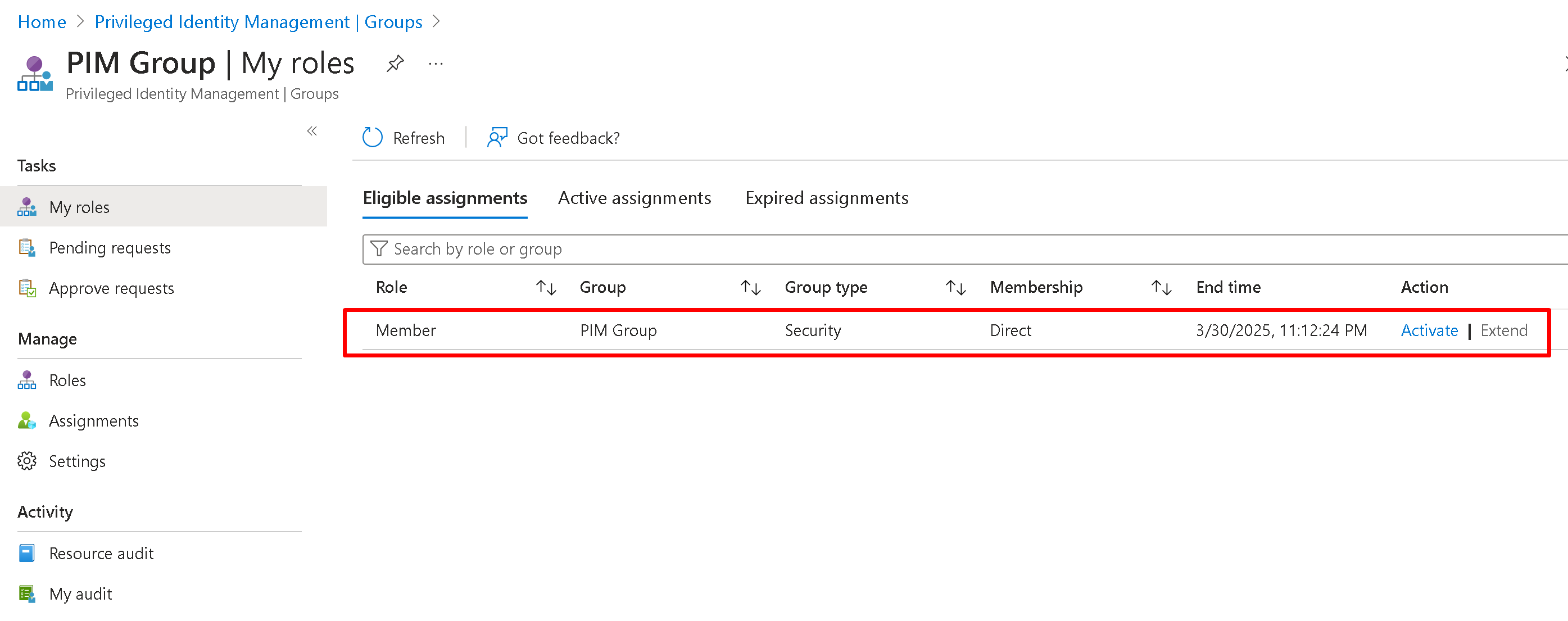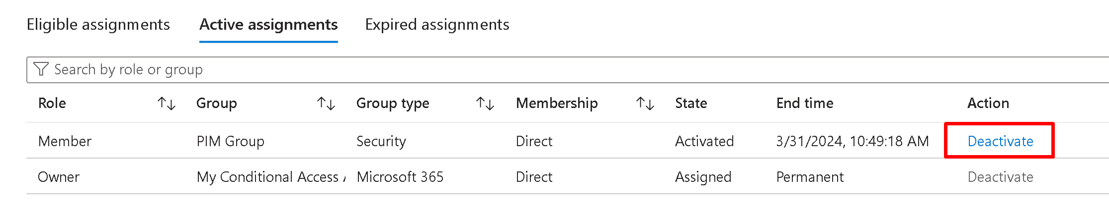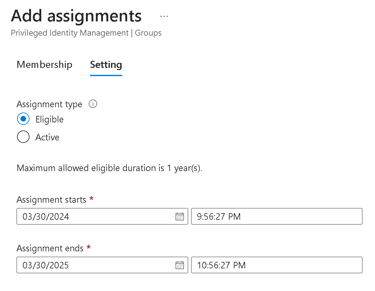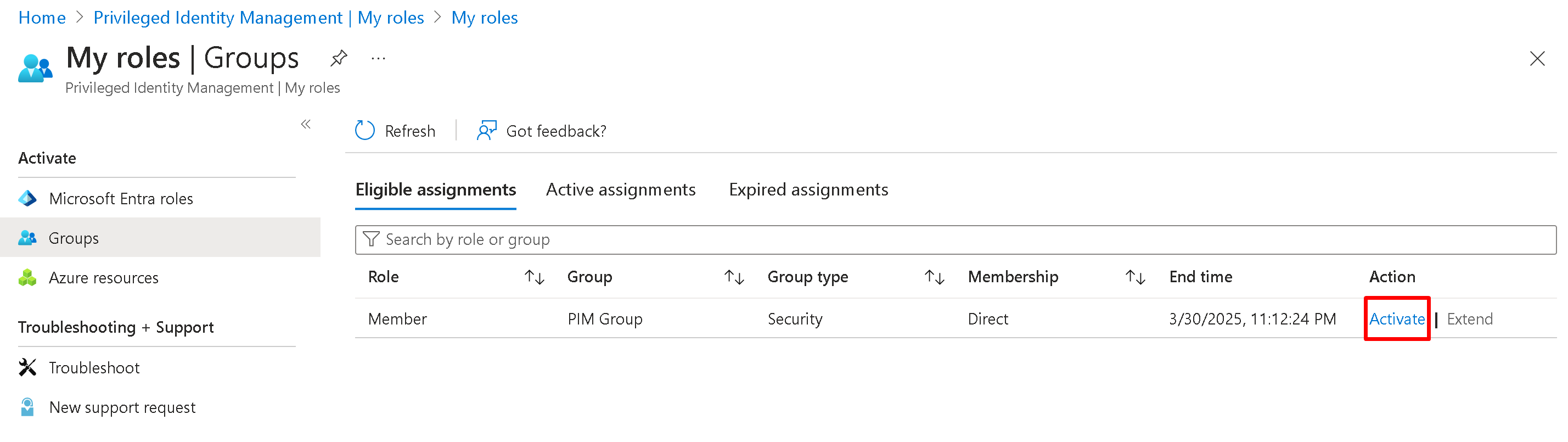 - Make a role assignment to a group active and designate users who are eligible to join the group.