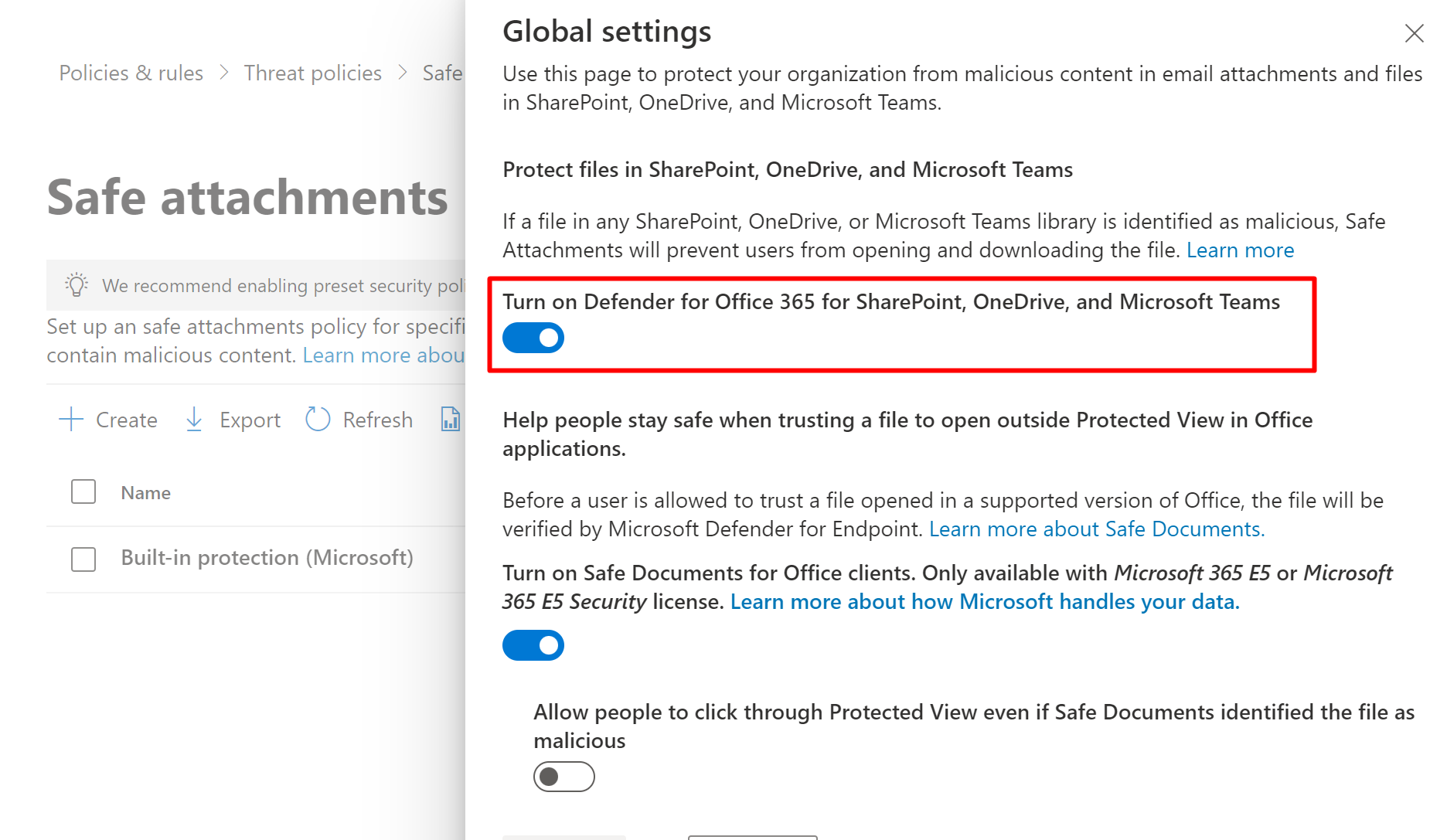 First you should enable Safe Attachments for SharePoint, OneDrive, and Microsoft Teams