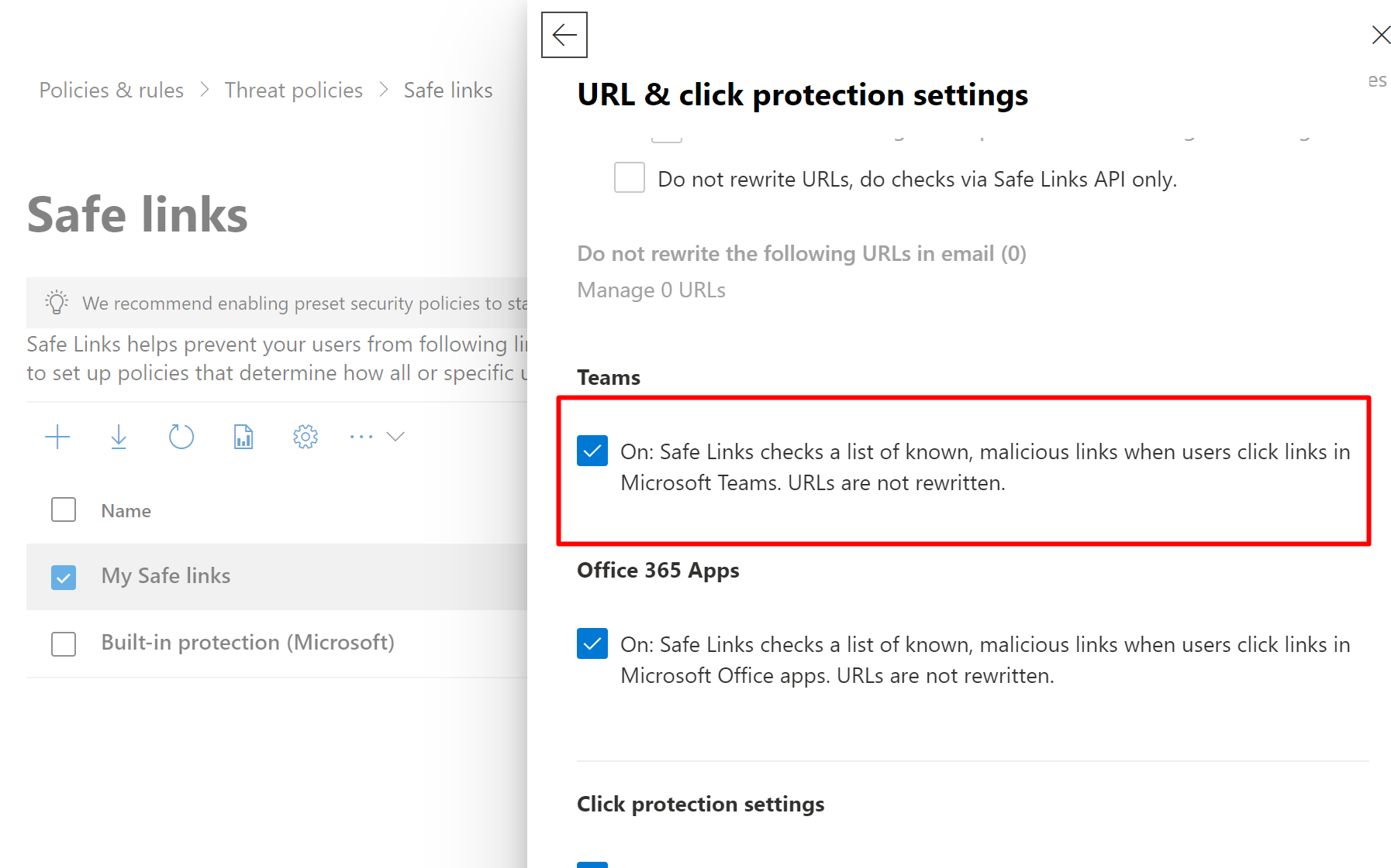 Open existing policy or create a new one an select "When users click links in Microsoft Teams, Ensure Safe Links checks a list of known, malicious links"