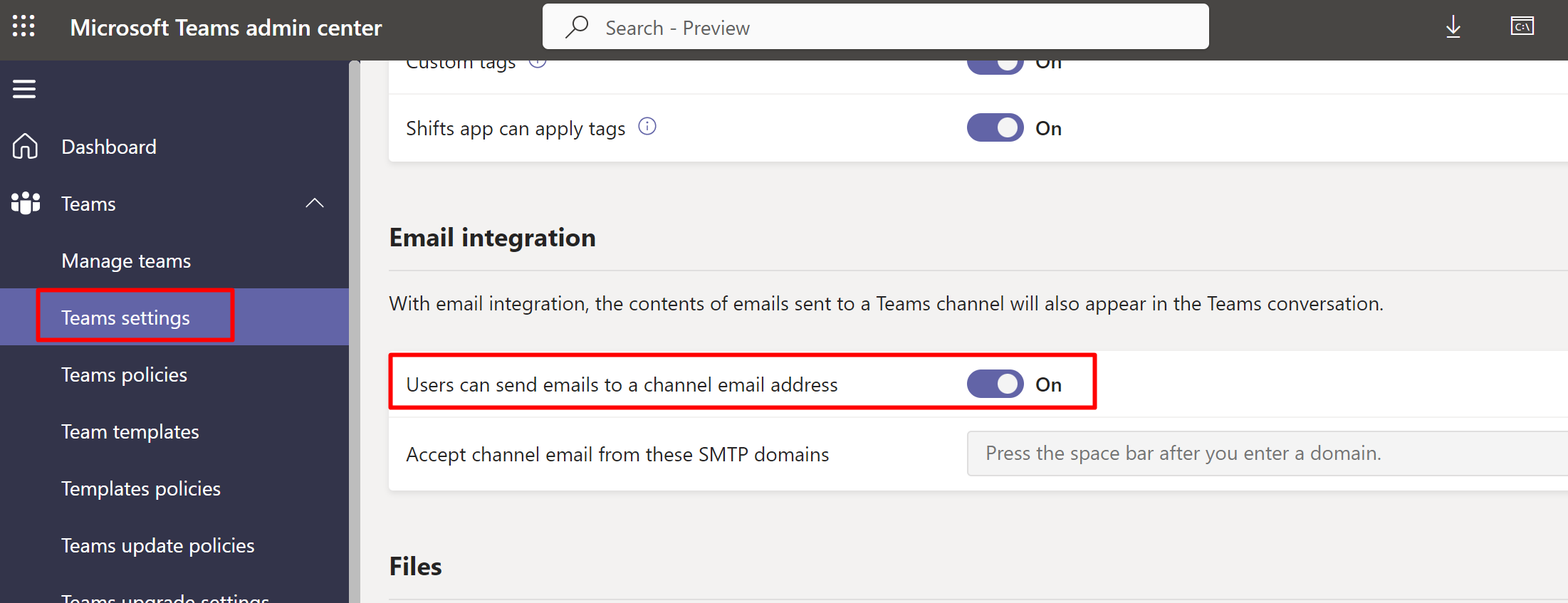 Under the Email integration heading, choose to allow or disallow users to send emails to a channel email address by toggling Users can send emails to a channel email address.