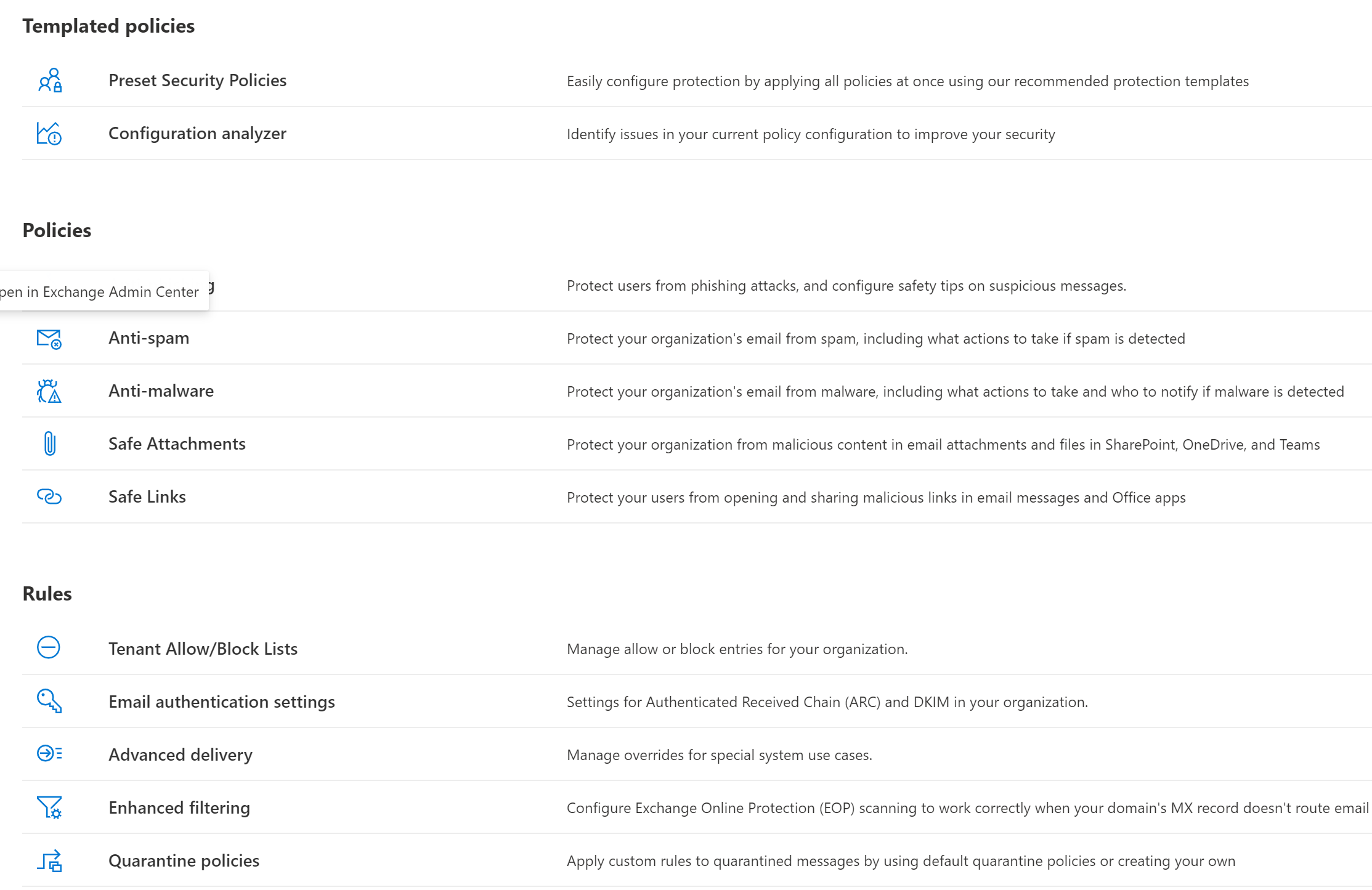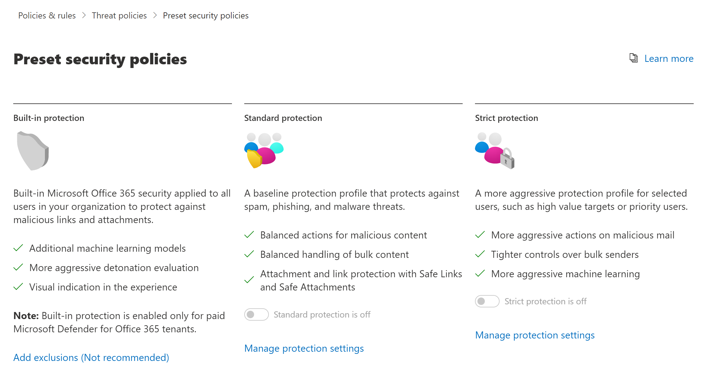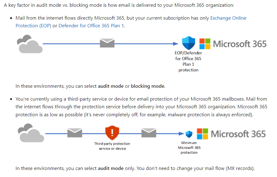 - Do I want to passively observe what Defender for Office 365 Plan 2 can do for me (audit), or do I want Defender for Office 365 Plan 2 to take direct action on issues that it finds (block)?