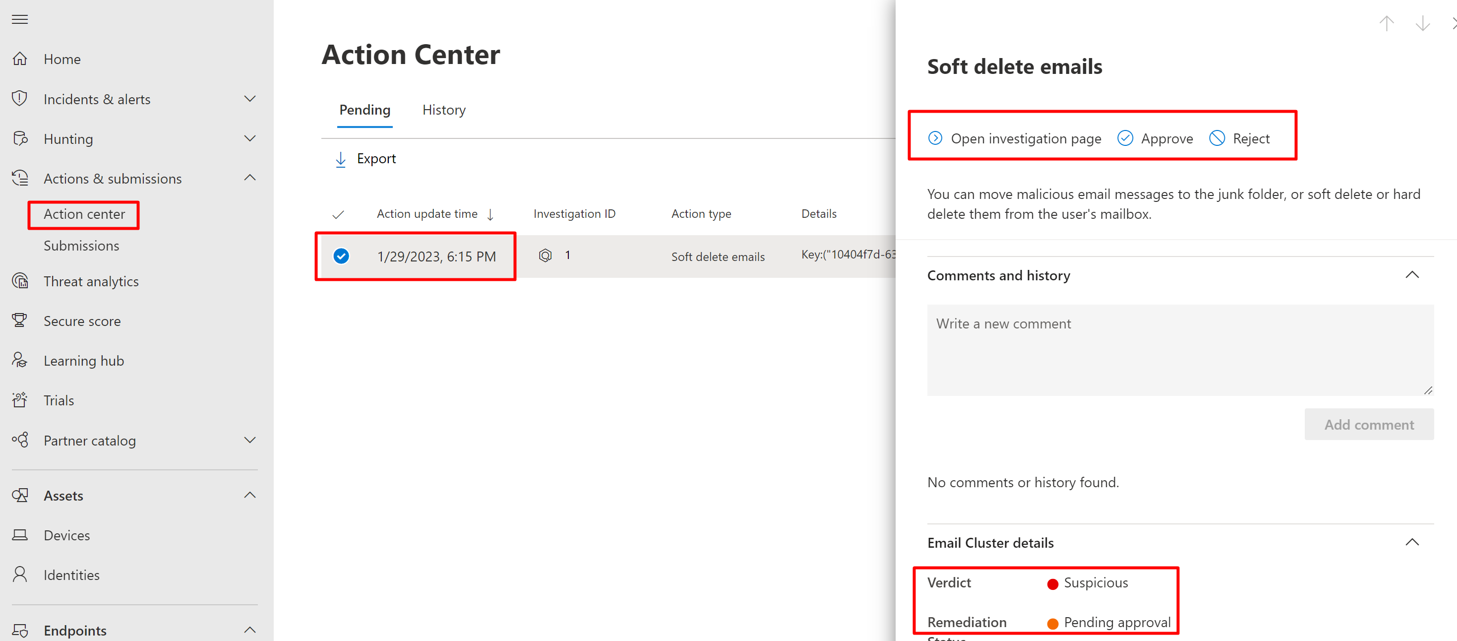 | Suspicious | Devices or email content | Recommended remediation actions are pending approval |