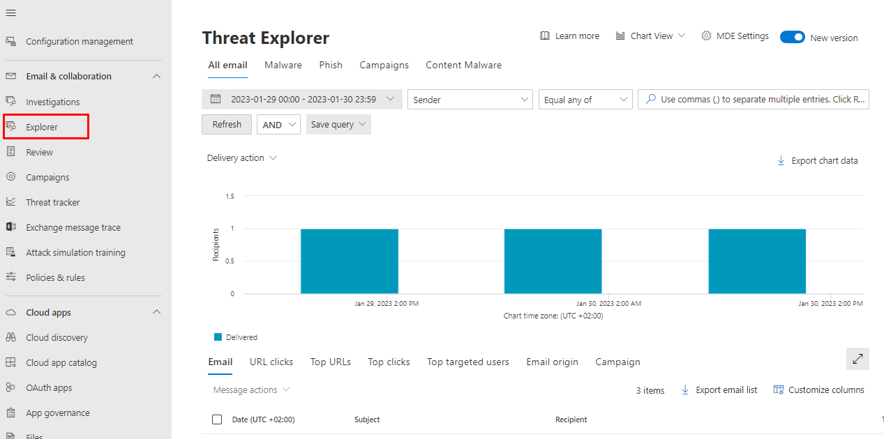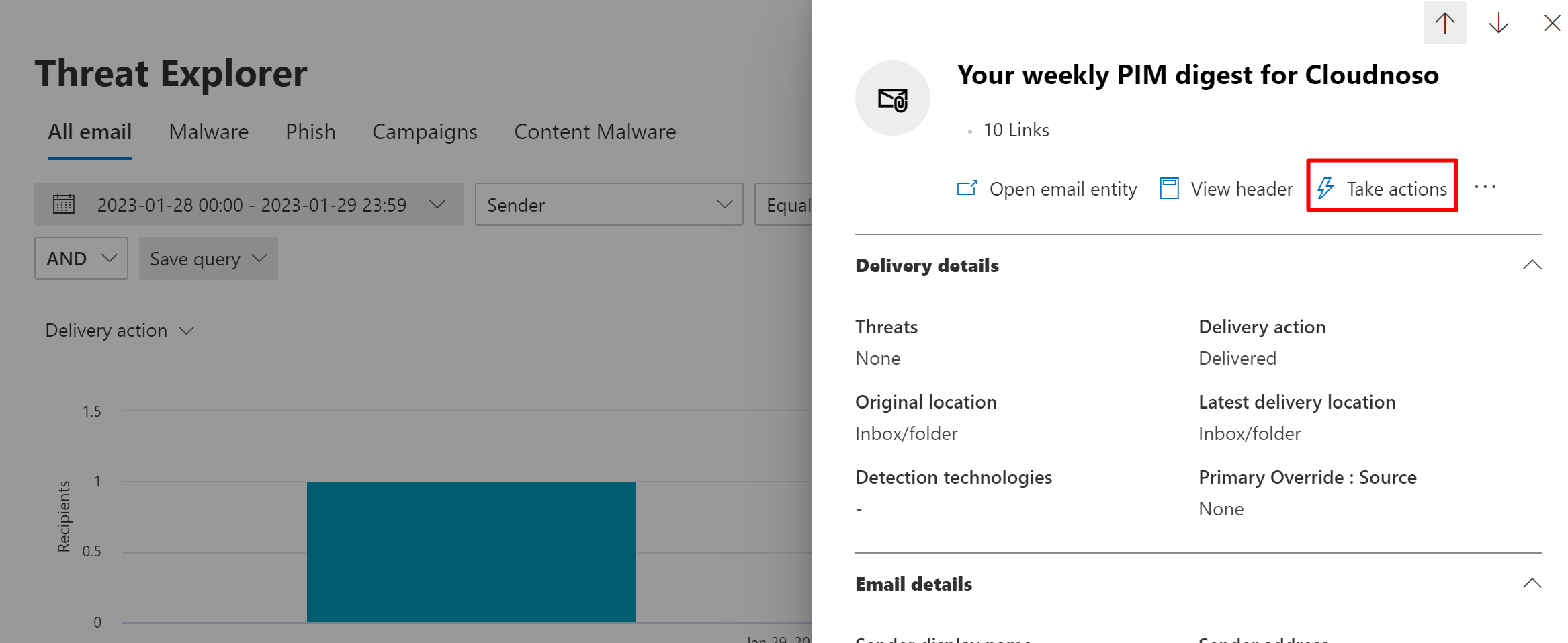 - Explorer action on email content, such as moving email to junk, soft-deleting email, or hard-deleting email