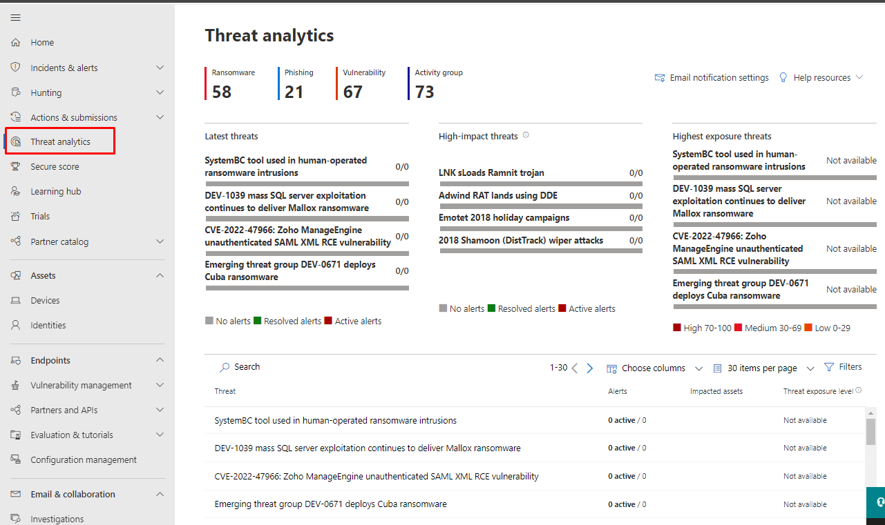 - Different places to search for possible threats, Explorer, Threat Analytics and alerts.
