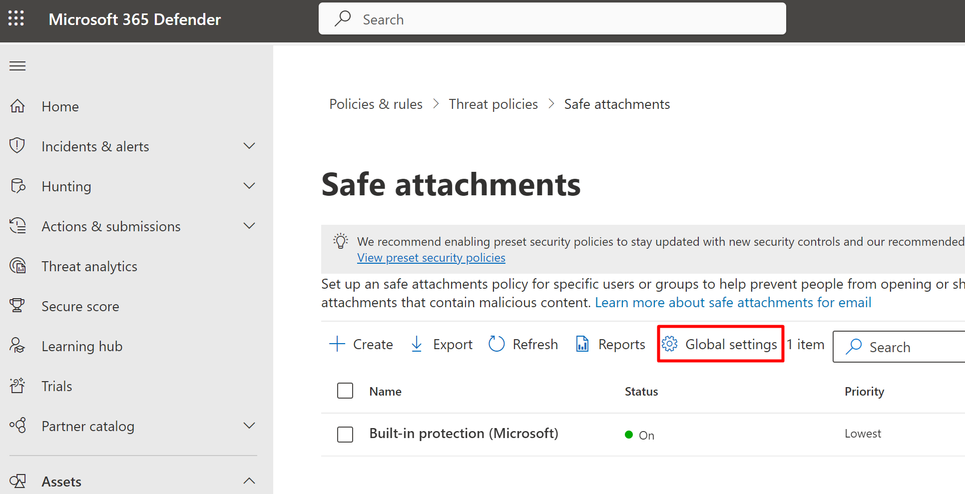Access the safe attachments configuration page in the security center at https://security.microsoft.com/safeattachmentv2 Select Global settings