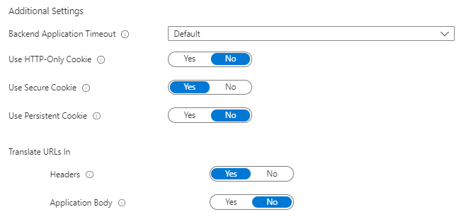 - HTTP-Only Cookie: Provides additional security by having Application Proxy include the HTTPOnly flag in set-cookie HTTP response headers. This setting helps to mitigate exploits such as cross-site scripting (XSS). Leave this set to No for clients/user agents that do require access to the session cookie. For example, RDP/MTSC client connecting to a Remote Desktop Gateway published via App Proxy.