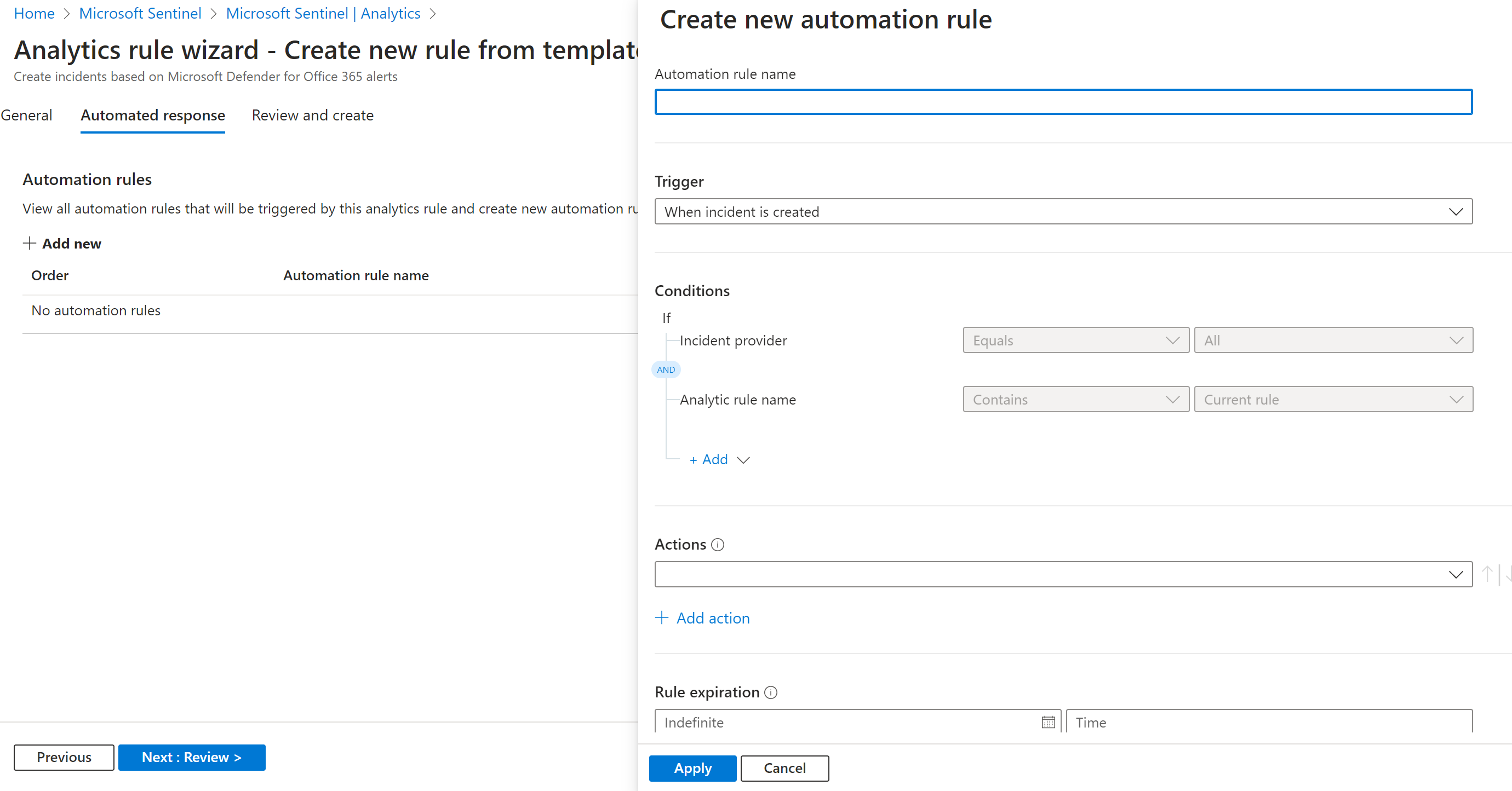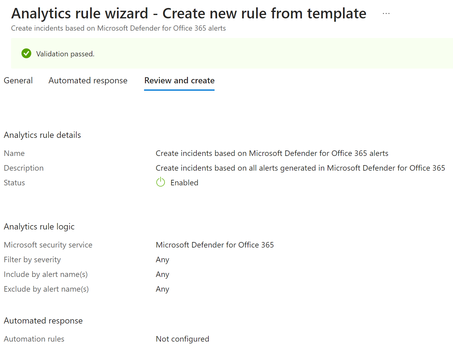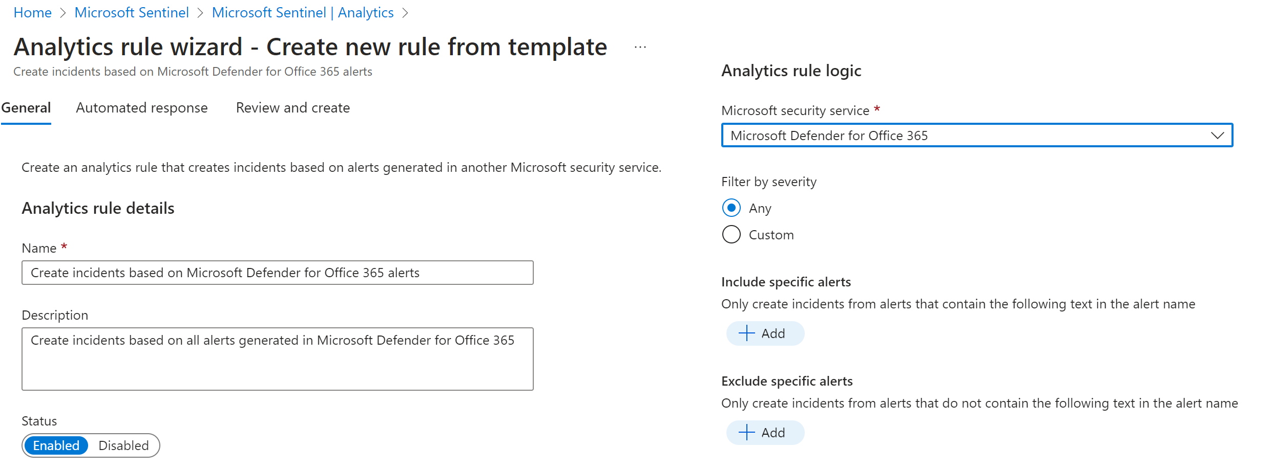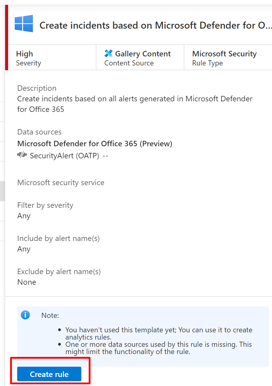 Choose a template, I will use Defender for Office 365. Note that Create rule button may be disabled for certain rule templates, indicating that you are unable to create a rule from the selected template due to a missing data source.