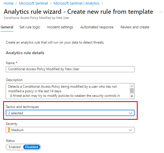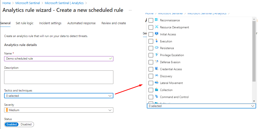 Once you start creating the Scheduled query, you can also choose MITRE tactics for it.