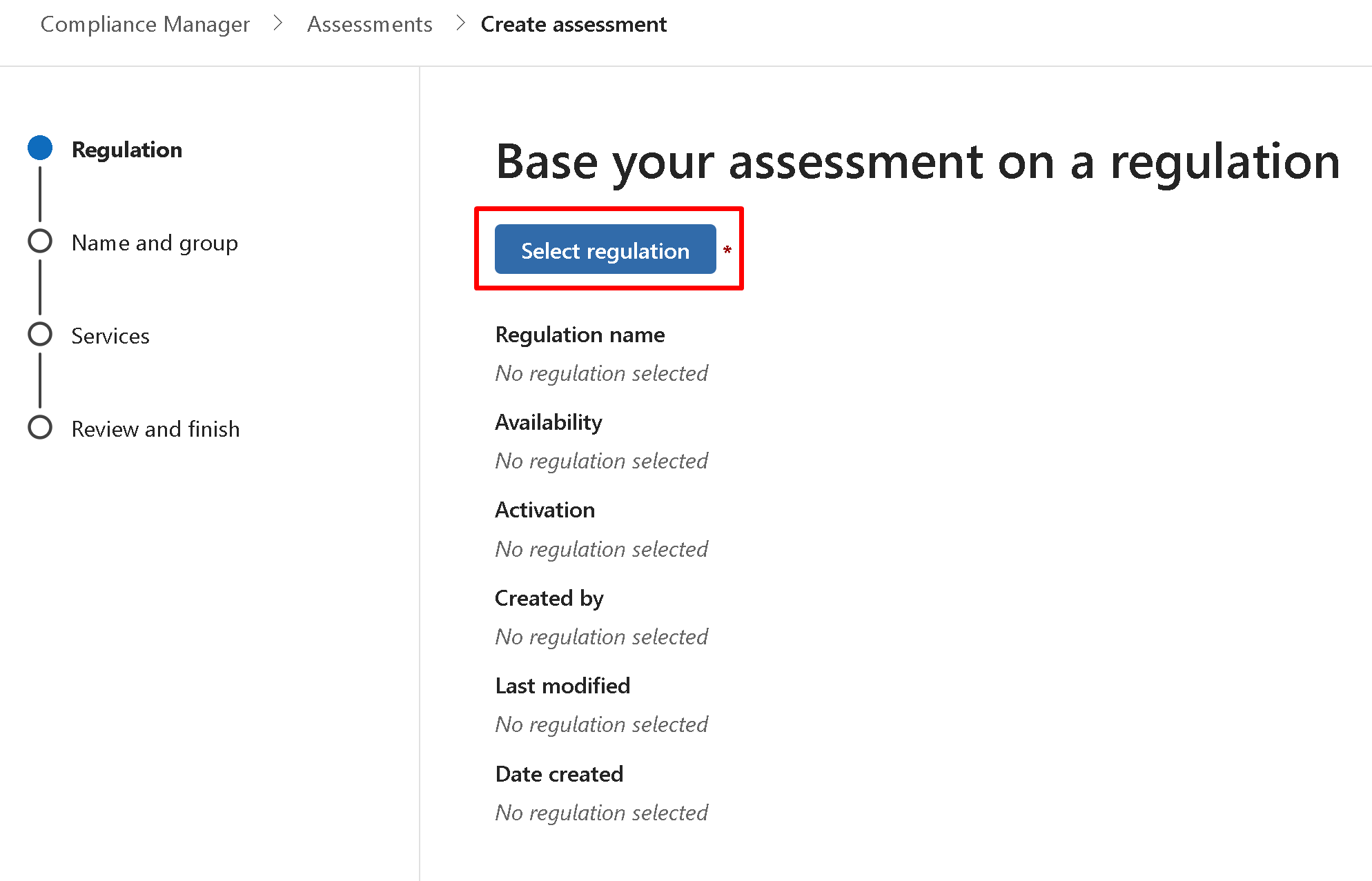 Select "Select regulation" to pick a regulatory template for your assessment.