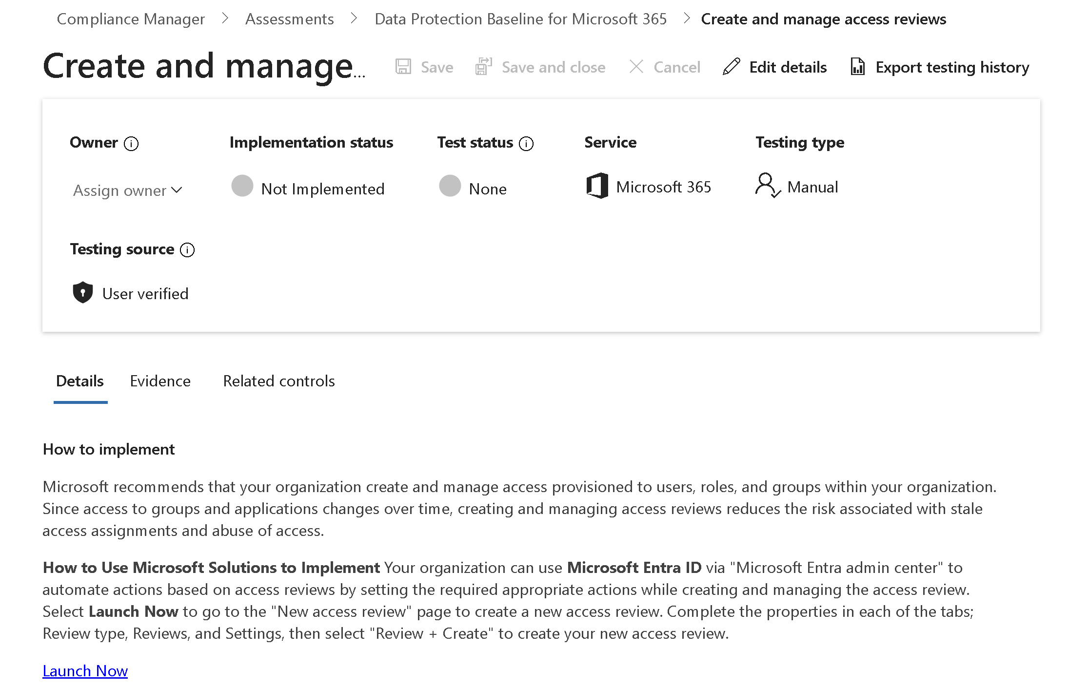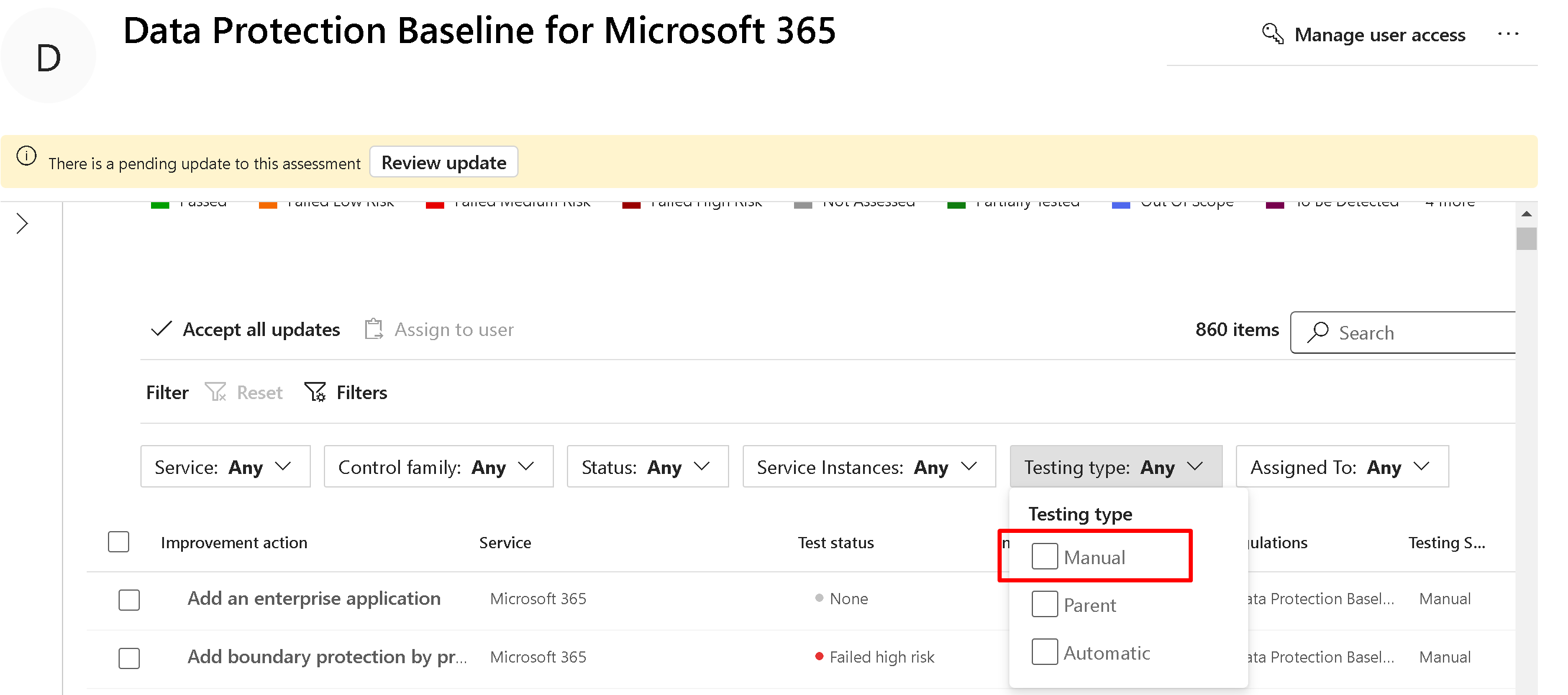 Compliance Manager provides options for how to test improvement actions. On the improvement action’s details page, the Testing type status in the top information bar shows how the action is tested. From here you can choose how you want the action to be tested: Manual or Automatic.