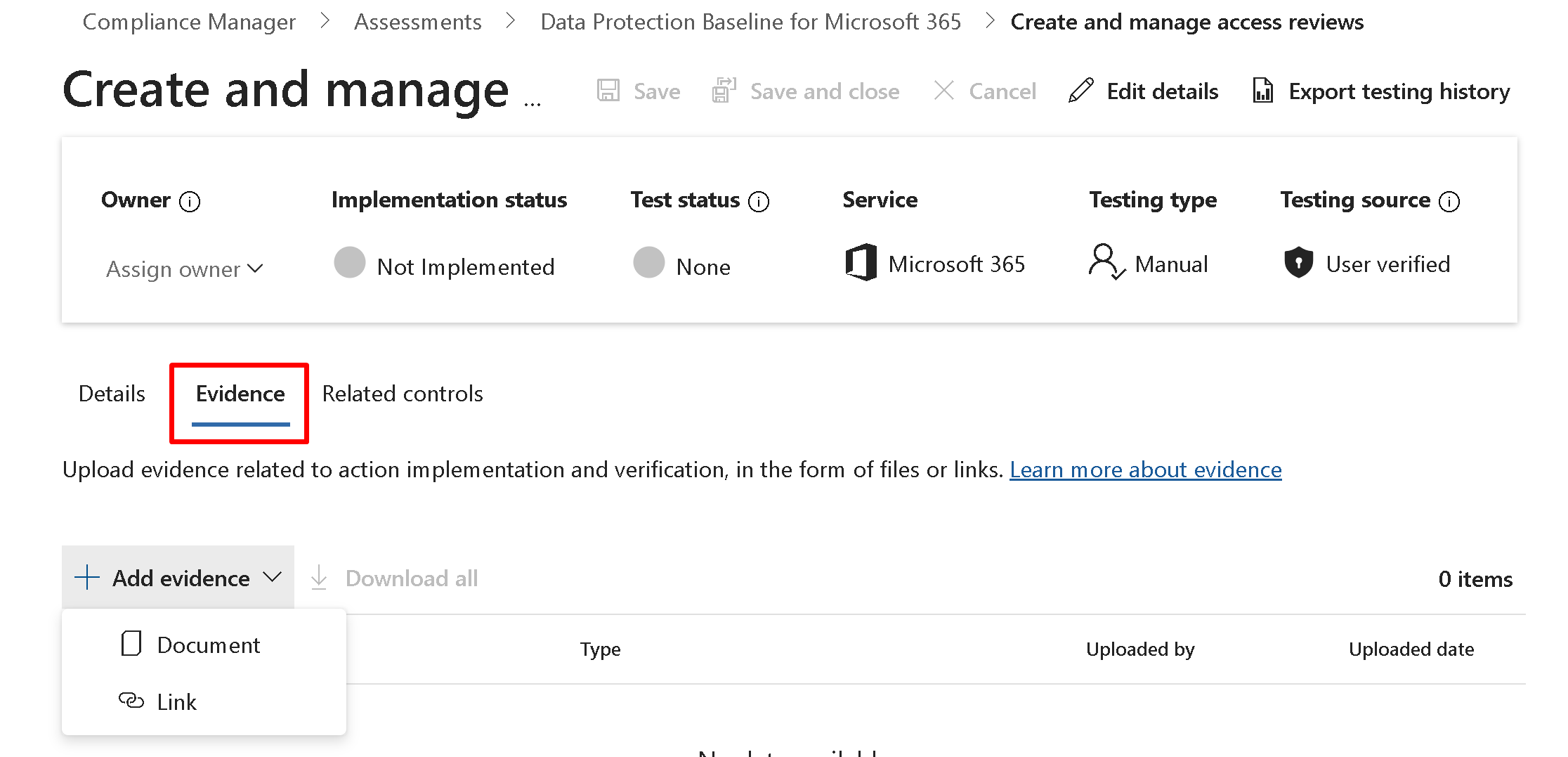 Improvement actions set for manual testing are actions that you manually test and implement. You set the necessary implementation and test status states, and upload any evidence files on the Evidence tab. For some actions, this is the only available method for testing improvement actions