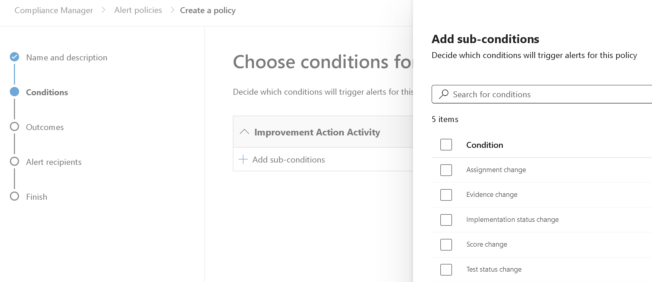 Choose the events that trigger your alert (assignment change, evidence change, etc.). Select "Add sub-conditions" to further refine your criteria. Click "Next" when finished.