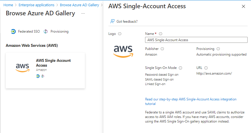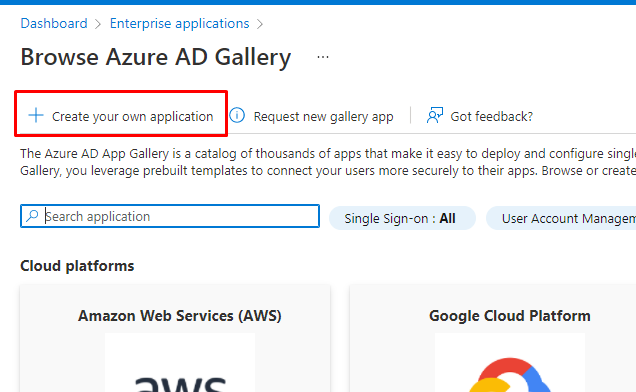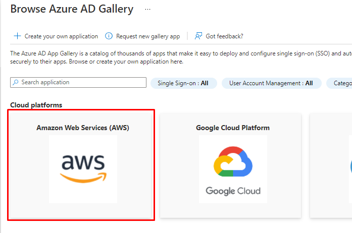 Go to add another application and add from gallery. I will use AWS in my demo.