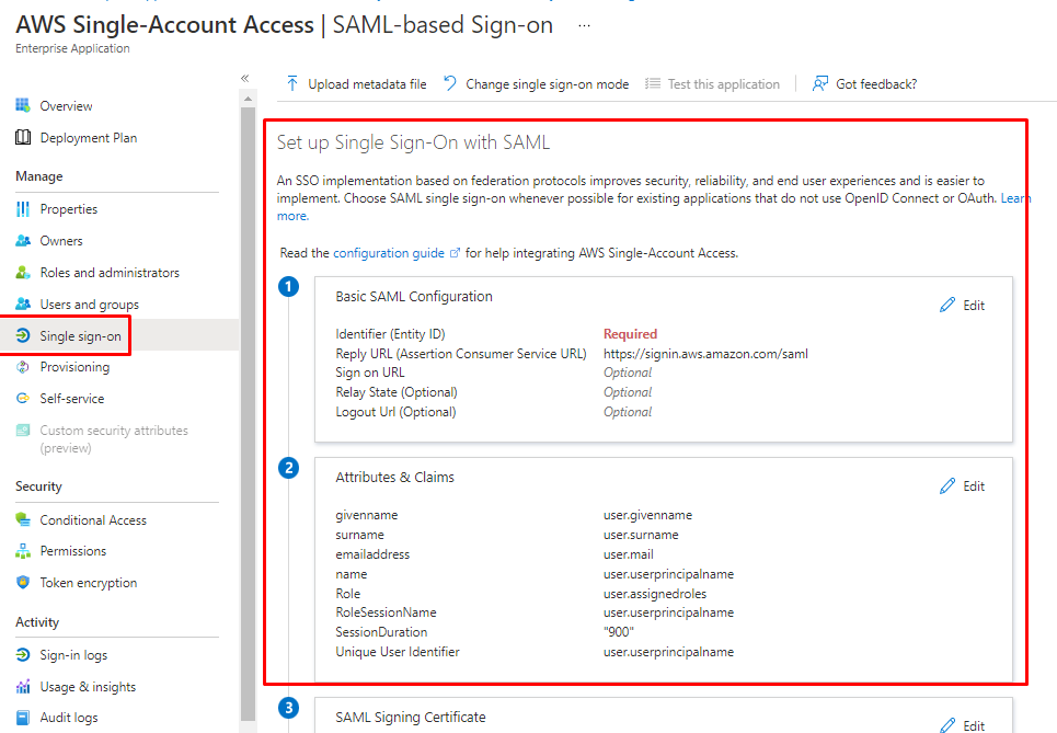 Get the federation metadata from Enterprise application, you will need it soon enough.