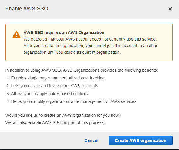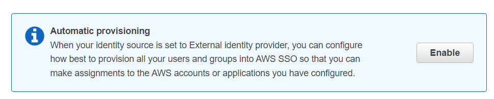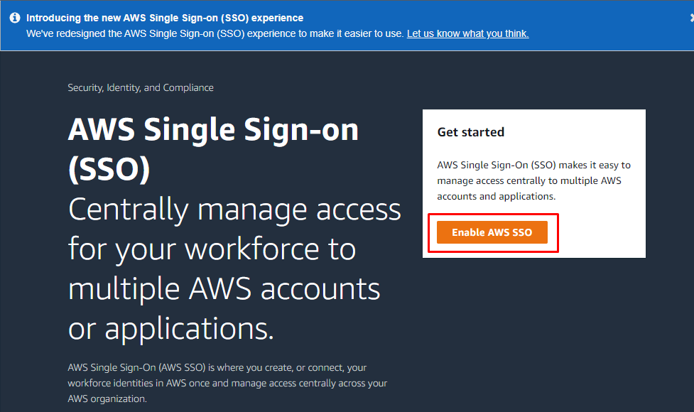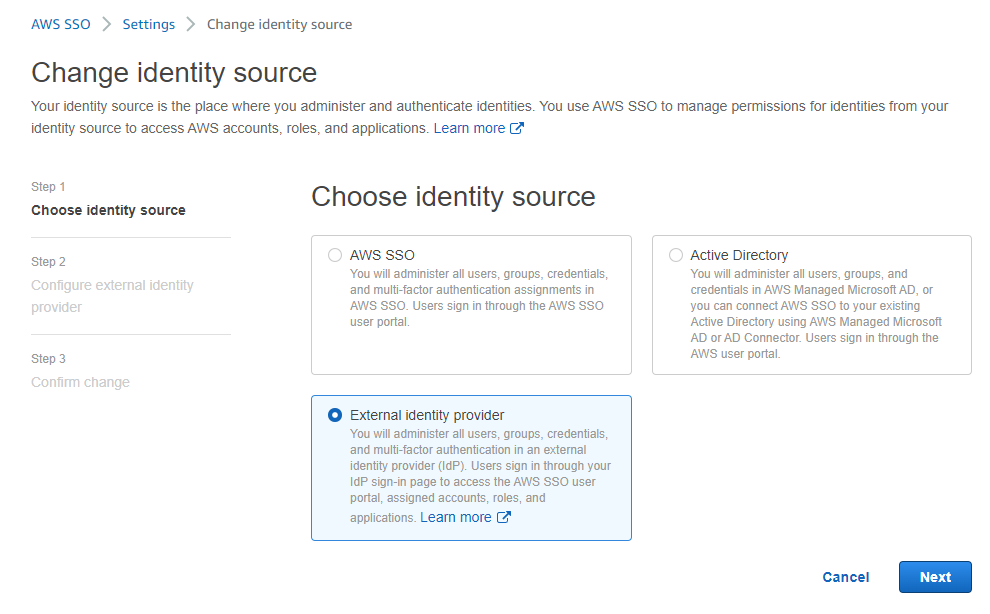 Choosing an identity source determines where AWS SSO looks for users and groups that need SSO access. By default, you get an AWS SSO store for quick and easy user management. Optionally, you can also connect an external identity provider or connect an AWS Managed Microsoft AD directory with your self-managed Active Directory.