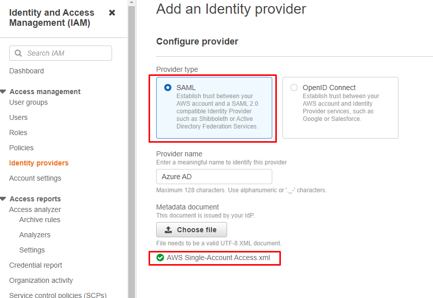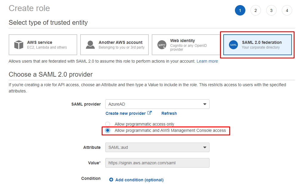 Choose SAML 2.0 federation and "Allow programmatic and AWS Management Console access"