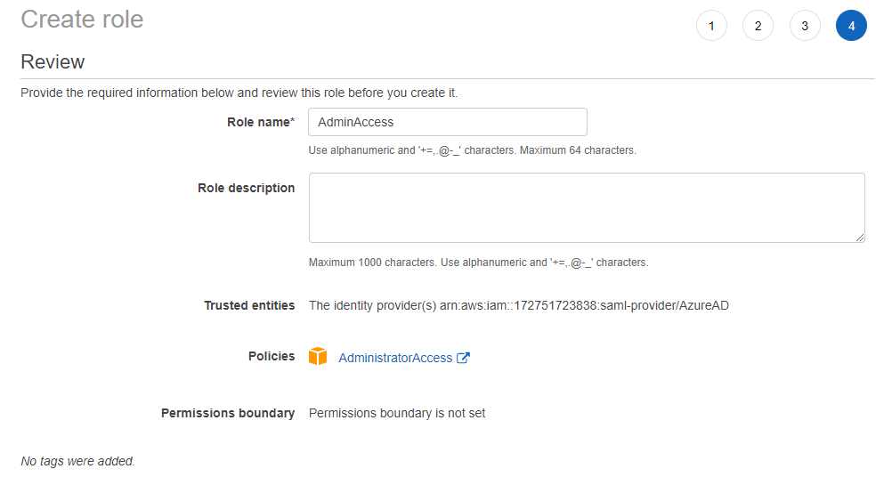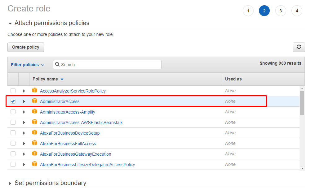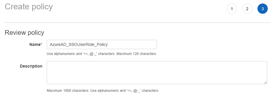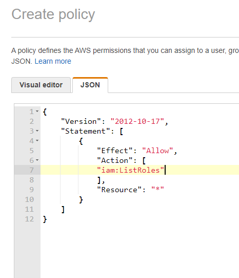 { "Version": "2012-10-17", "Statement": , "Resource": "*" } ] }Add a name and select create policy