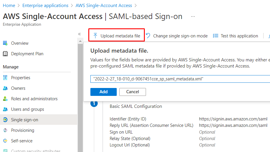 Give it a name and upload the metadata file from your Enterprise application that we got in the beginning.