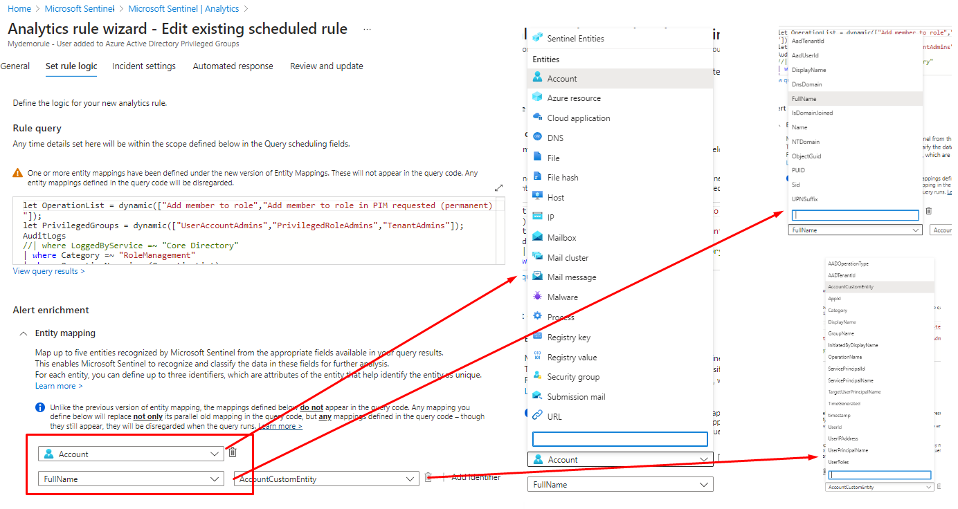 When you create a new rule under Sentinel -> Analytics or edit an existing one, you will find the Entities under Rule logic.