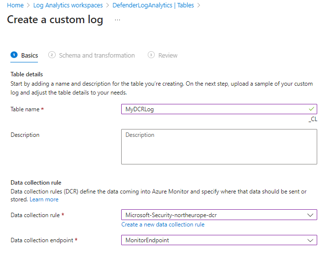 | Custom logs | Configure custom logs by using the Azure portal Configure custom logs by using Azure Resource Manager templates and the REST API | Send custom data by using a REST API. The API call connects to a data collection endpoint and specifies a DCR to use. The DCR specifies the target table and potentially includes a transformation that filters and modifies the data before it's stored in a Log Analytics workspace. |