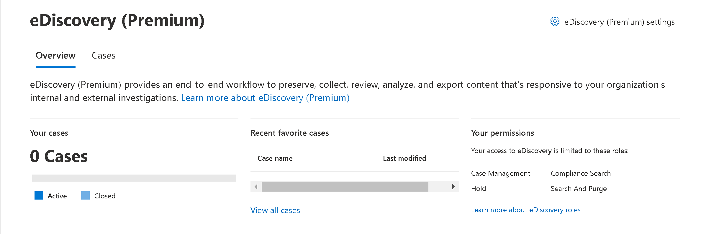 - Case Management (Standard & Premium): Create, manage, and control access to eDiscovery cases.