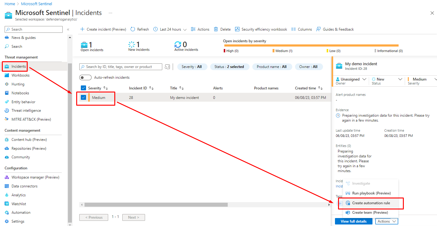 You can also use the Incidents blade to define an automation rule to respond to a single, reoccurring occurrence. This is important for designing a suppression rule to close "noisy" instances automatically.