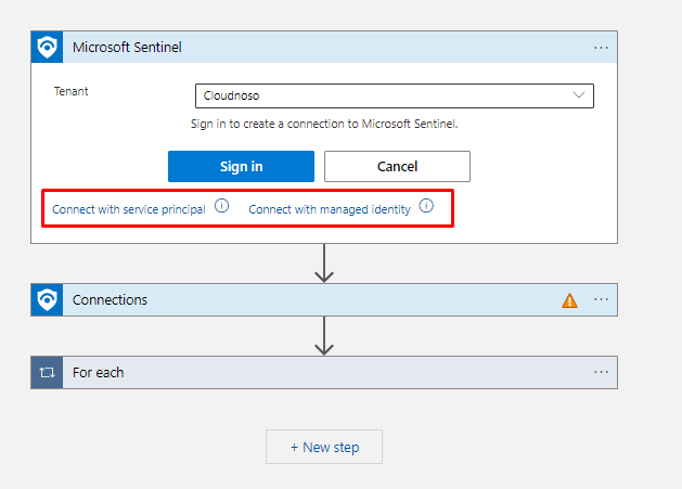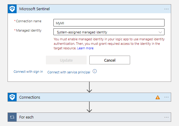 You can connect to Sentinel with Service principal (App registration) or with Managed identities