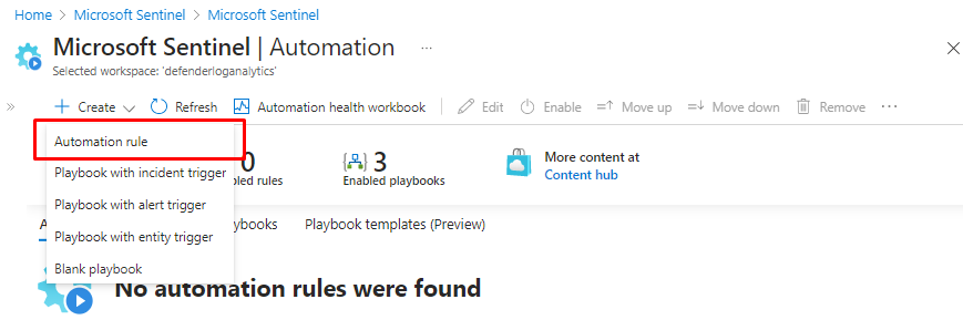 You can view every rule that has been defined on the workspace, together with its status (Enabled/Disabled), and the analytics rules it applies to, in the Automation blade.