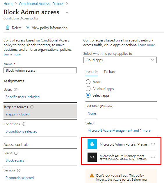 For this demonstration I will create an Conditional access policy that Block Azure and other Admin portal from a specific user.
