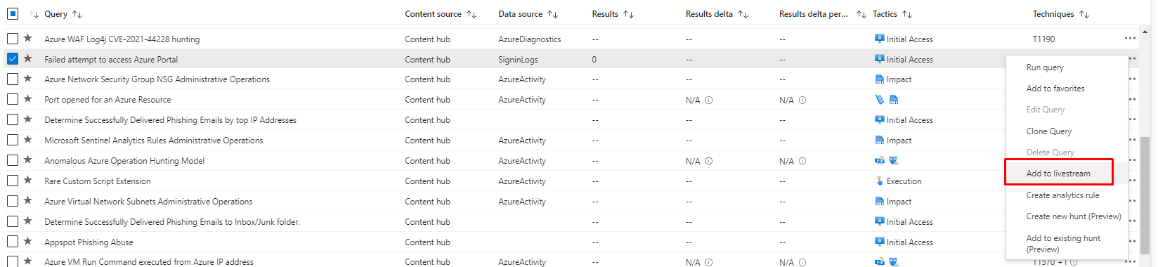 Open your Hunting queries and choose Add to livestream under the three dots.