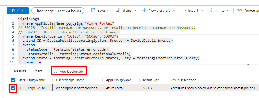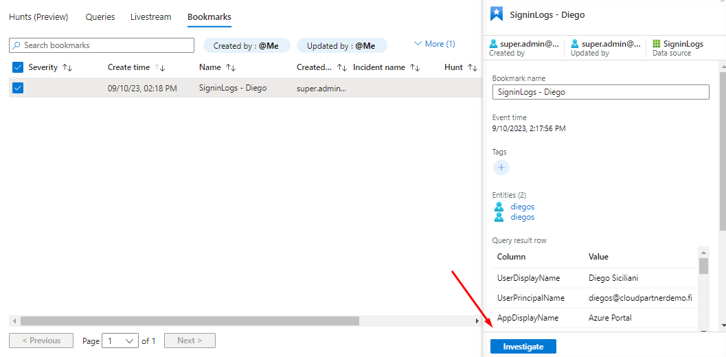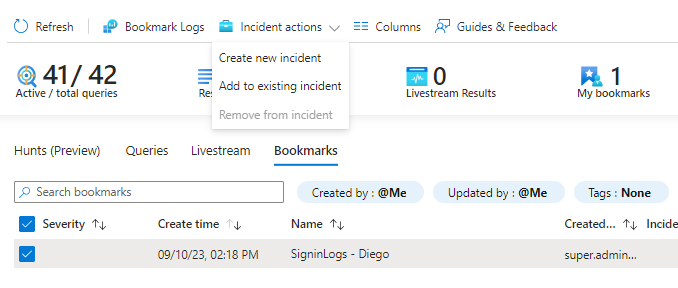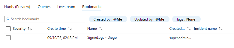 - Once you add the Bookmark, you can see under Hunting and Bookmarks