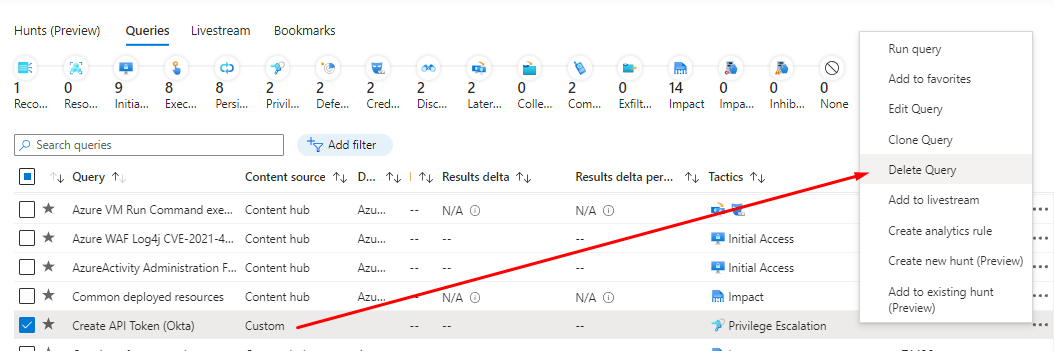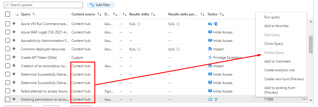 Note that you cannot directly delete a Hunting query that is import with a Content hub solution.