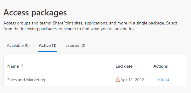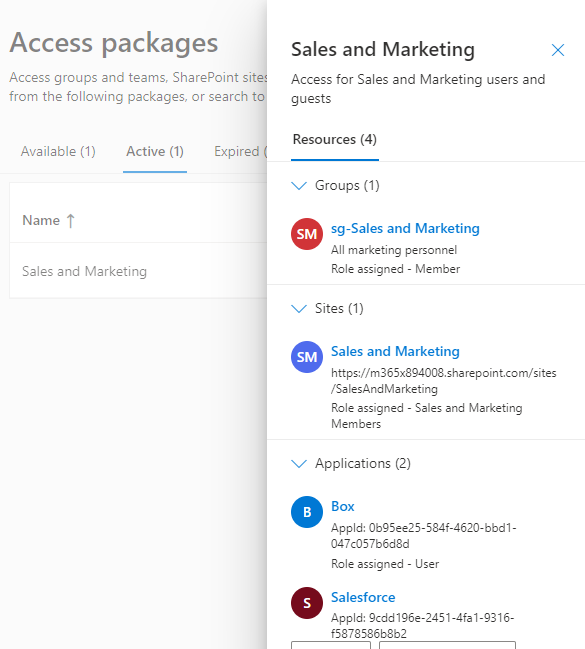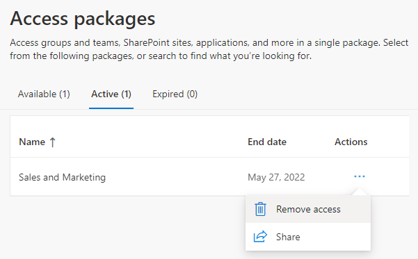 Similarly, you may have an application with two roles - Western Sales and Eastern Sales - and want to ensure that a user can only have one sales territory at a time. If you have two access packages, one access package Western Territory giving the Western Sales role and the other access package Eastern Territory giving the Eastern Sales role, then you can configure