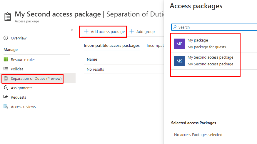 For example, you have an access package, Marketing Campaign, that people across your organization and other organizations can request access to, to work with your organization's marketing department while that campaign is going on. Since employees in the marketing department should already have access to that marketing campaign material, you don't want employees in the marketing department to request access to that access package. Or, you may already have a dynamic group, Marketing department employees, with all of the marketing employees in it. You could indicate that the access package is incompatible with the membership of that dynamic group. Then, if a marketing department employee is looking for an access package to request, they couldn't request access to the Marketing campaign access package.