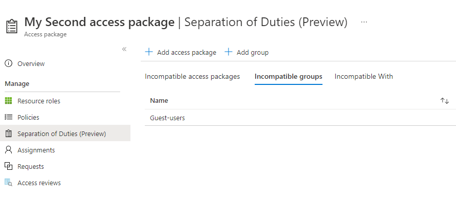 You can also configure the groups and other access packages that are incompatible with access package using Microsoft Graph. A user in an appropriate role with an application that has the delegated EntitlementManagement.ReadWrite.All permission, or an application with that application permission, can call the API to add, remove, and list the incompatible groups and access packages of and access package.