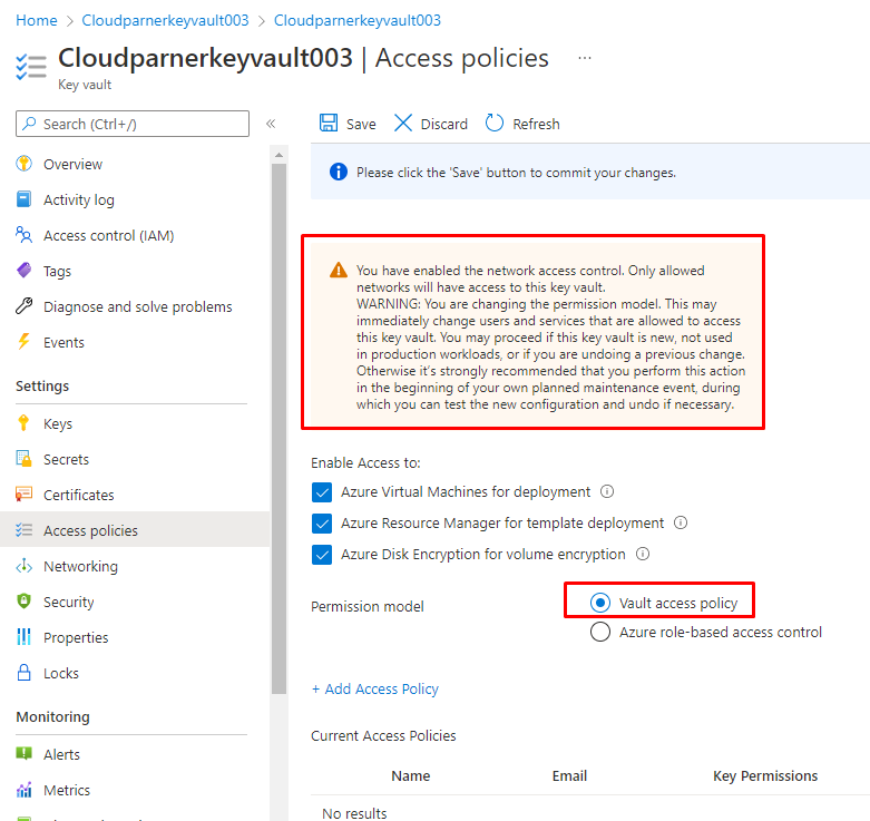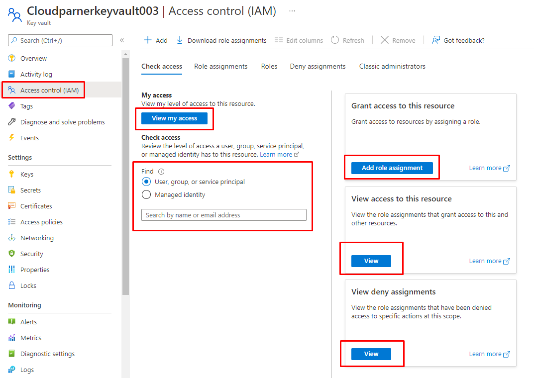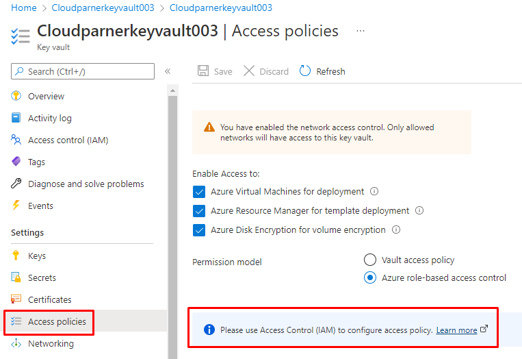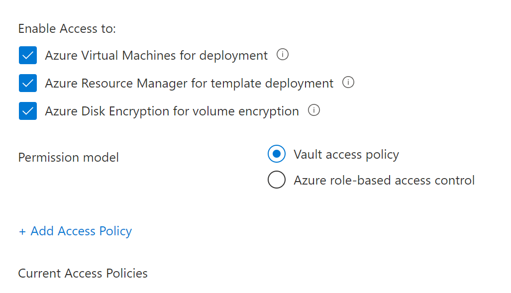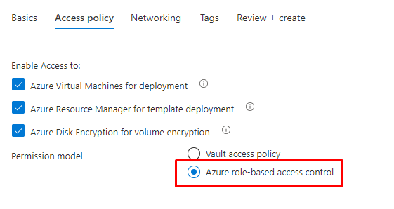 - Depending on the permission model of the key vault (access policy or Azure RBAC), key vault access can be granted either by creating an access policy on the key vault, or by creating a new Azure RBAC role assignment with the role Key Vault Crypto Service Encryption User.