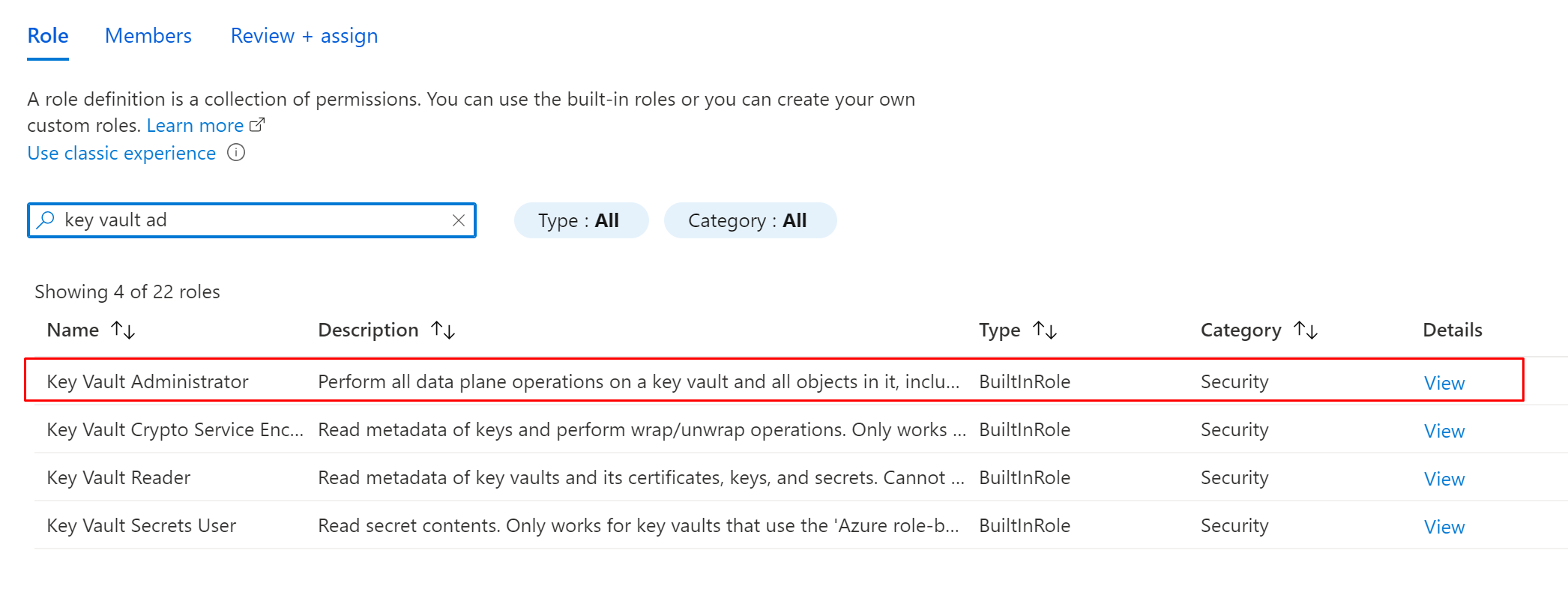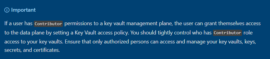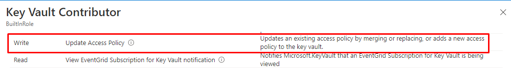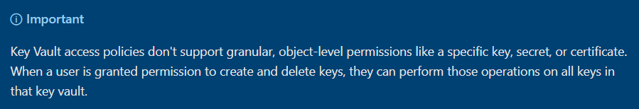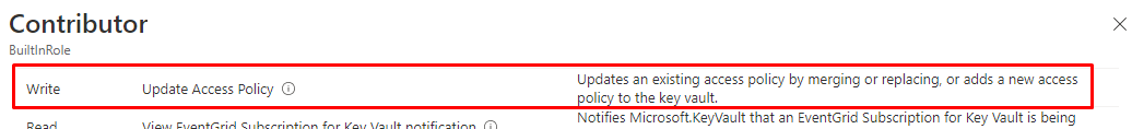 | Key, Secret, Certificate Management | Keys: all operations Certificates: all operations Secrets: all operations | Key Vault Administrator |