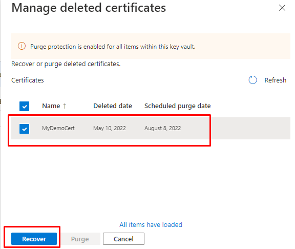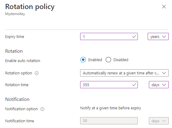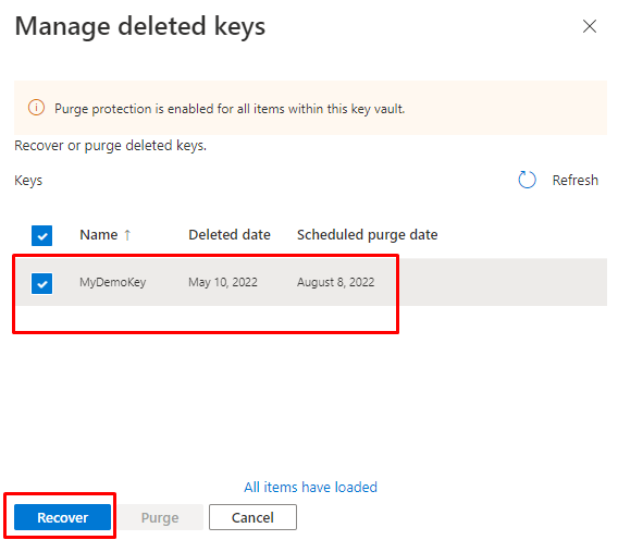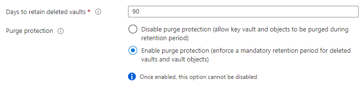- Purge protection can be turned on using Azure CLI or PowerShell. When purge protection is enabled, a vault or an object in the deleted state cannot be purged until the retention period has passed. The default retention period is 90 days, but is configurable from 7 to 90 days through the Azure portal.